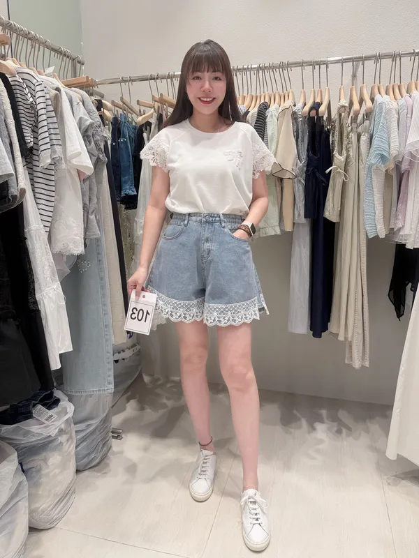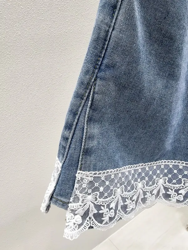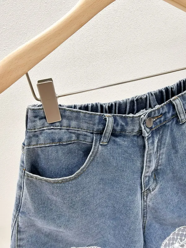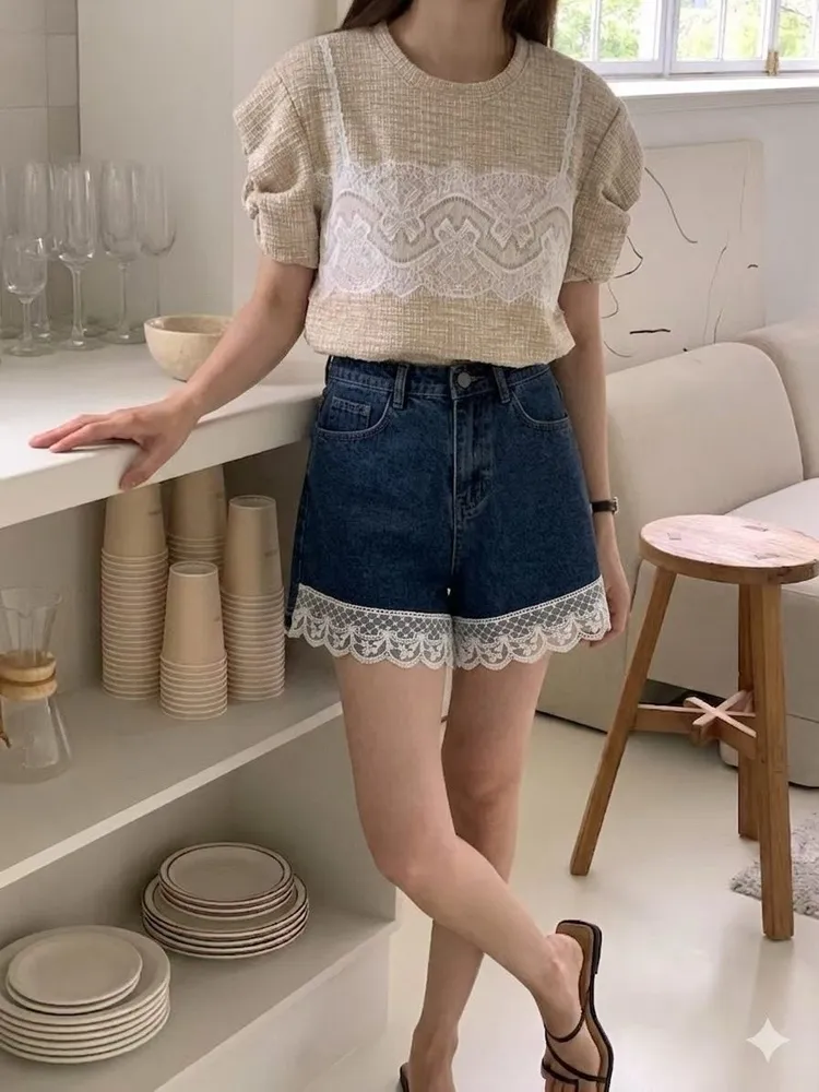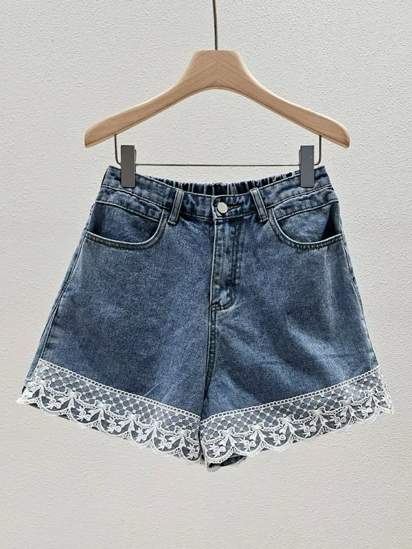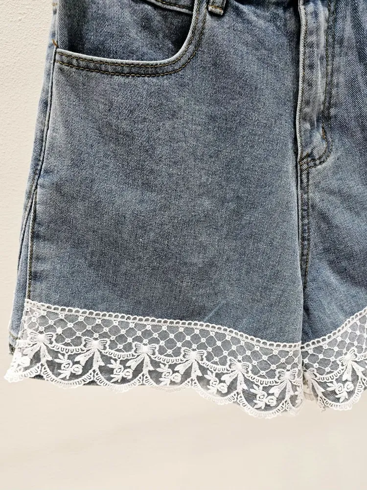 (特)拼接蕾絲牛仔短褲