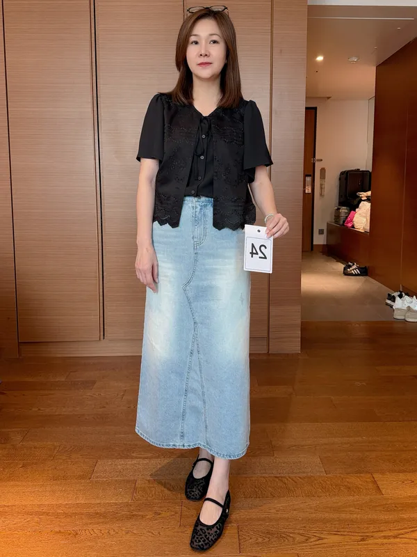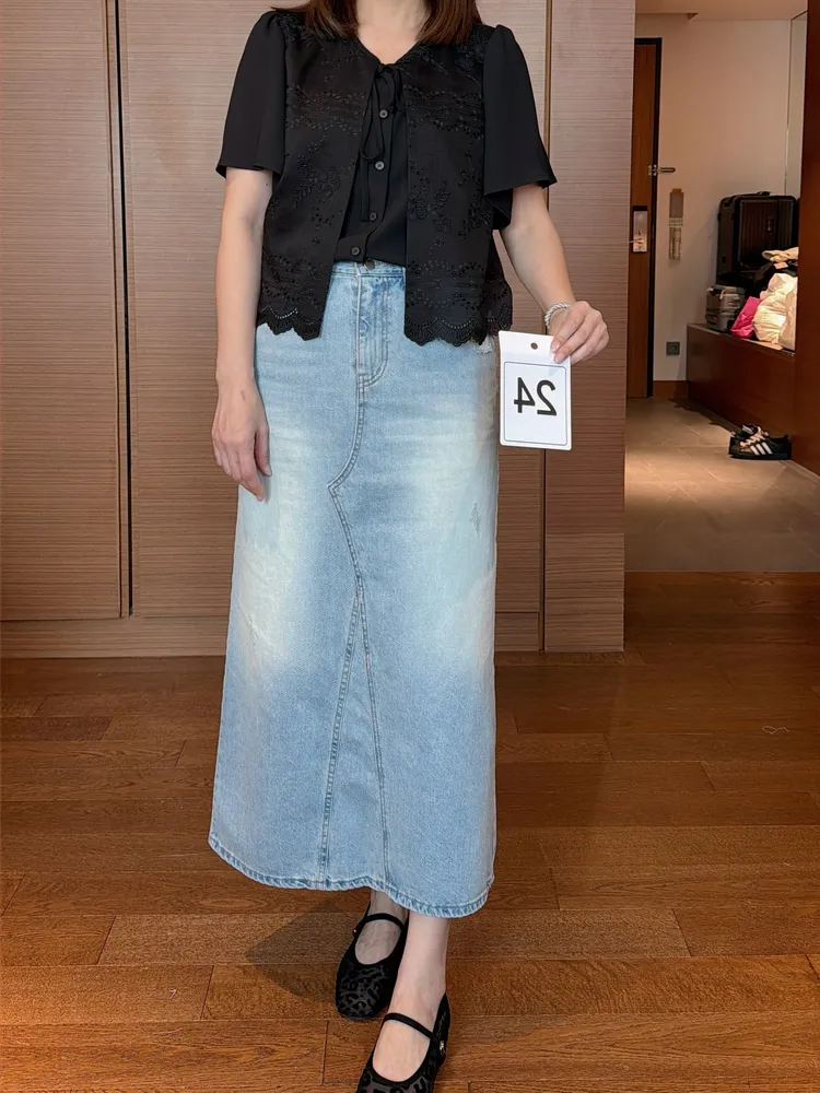 (特)微刷破直筒牛仔裙
